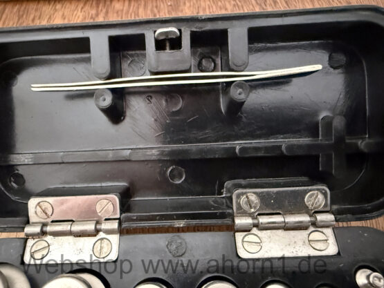 In einer schwarzen Dose. Bis auf 4 Plättchen ist es komplett.