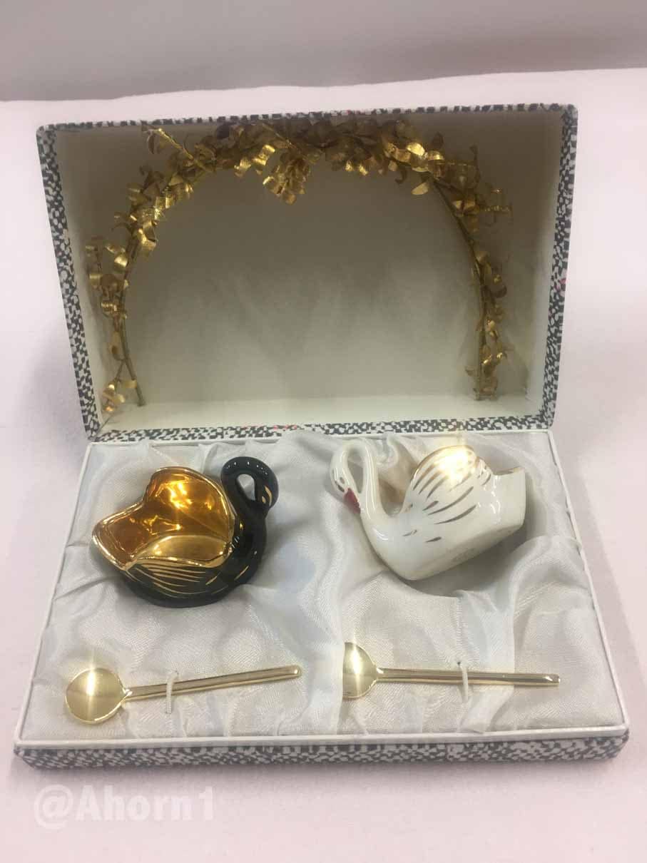 Sehr dekoratives 2er Set Schwäne von Limoges, für Salz und Pfeffer, Senf oder Kaviar, mit 2 Löffel! Die Schwäne befinden sich im Originalkarton! Siehe Bilder!!