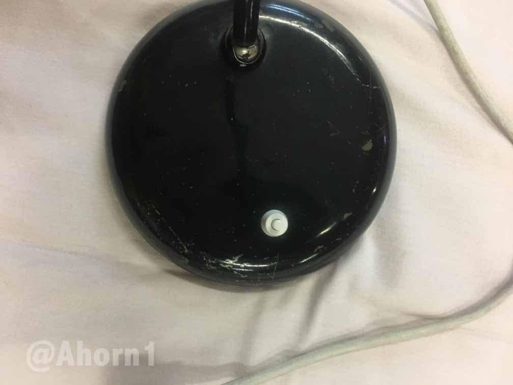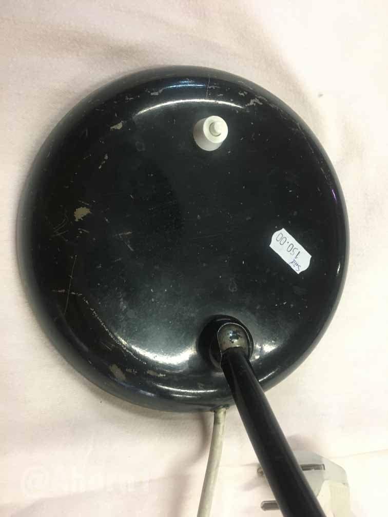 schwarze Lackierung, guter Zustand, Hals ist stabil, ganz ausgestreckt ist die Lampe incl. Schirm ca. 55cm hoch, Schirm dm 23cm, Fuß dm ca. 18cm, das erneuerte Kabel ist ca. 60cm lang.